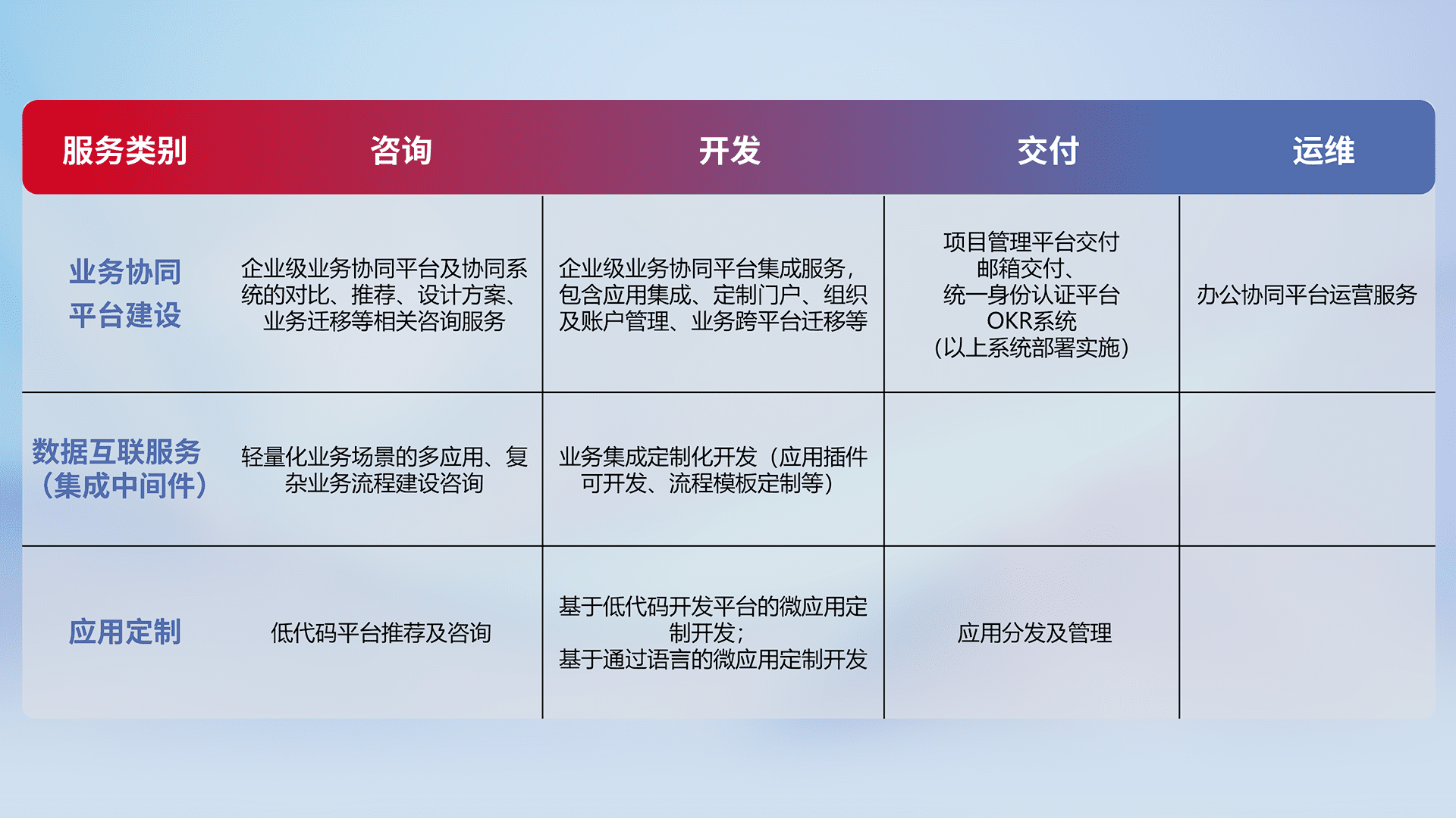 针对钉钉、、企微、、、IDaas等平台级产品提供产品的规划、、、、方案、、、、交付、、、定制化开发等服务,,,,实现如统一协同办公、、、智能客户服务、、、混合会议管理、、智能数据查询、、、、等业务场景,,实现数字化转型。。。